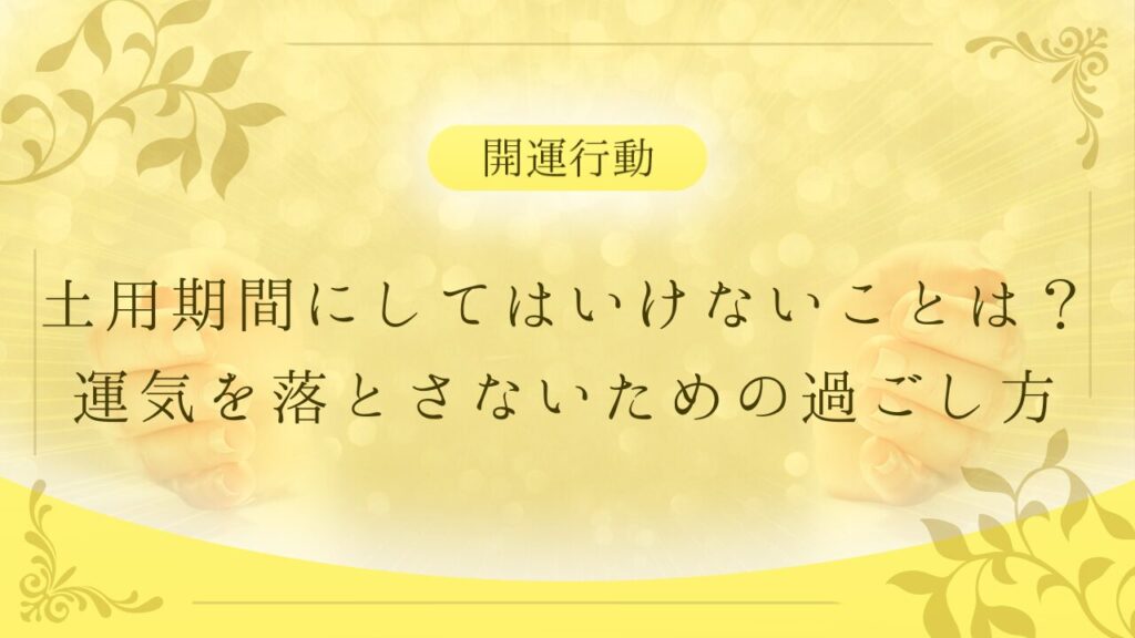土用期間は、旧い季節の運気が終わりを迎え、新しい季節のエネルギーに切り替わる“端境期(はざかいき)”となります。この時期は心身のコンディションが乱れやすく、予期せぬトラブルが起きがちです。だからこそ「無理をしない」「環境を大きく動かさない」ことが開運のポイントになります。